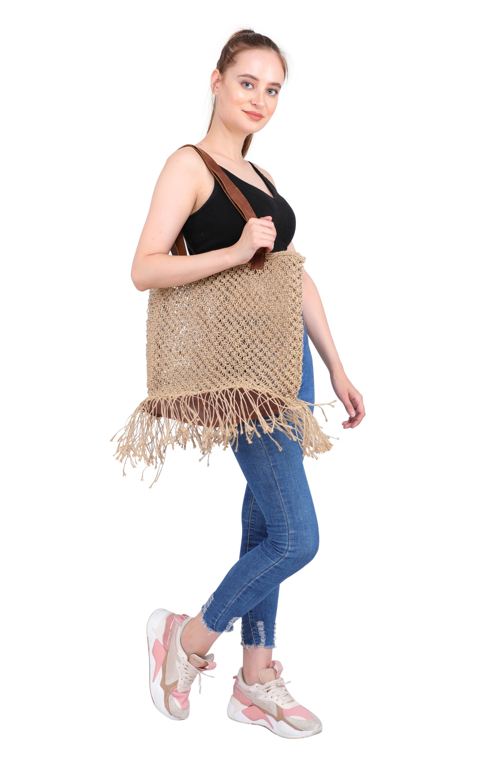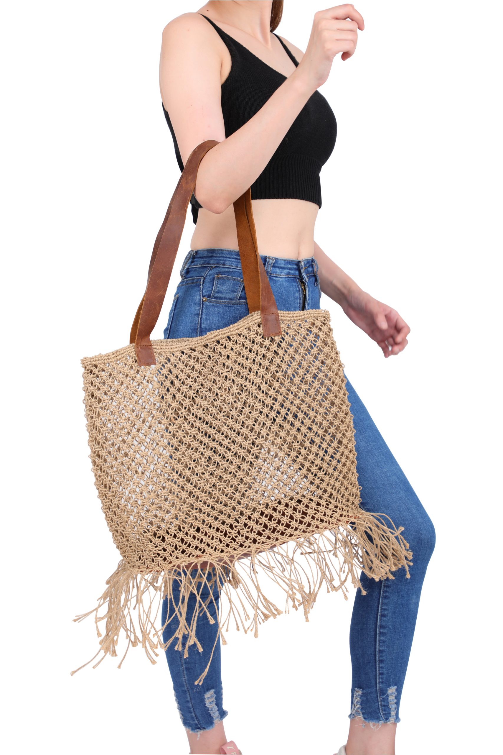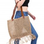 This different style, Jute Tote bag with leather handle is a perfect bag to carry it on a beach. It is unique and spacious.
