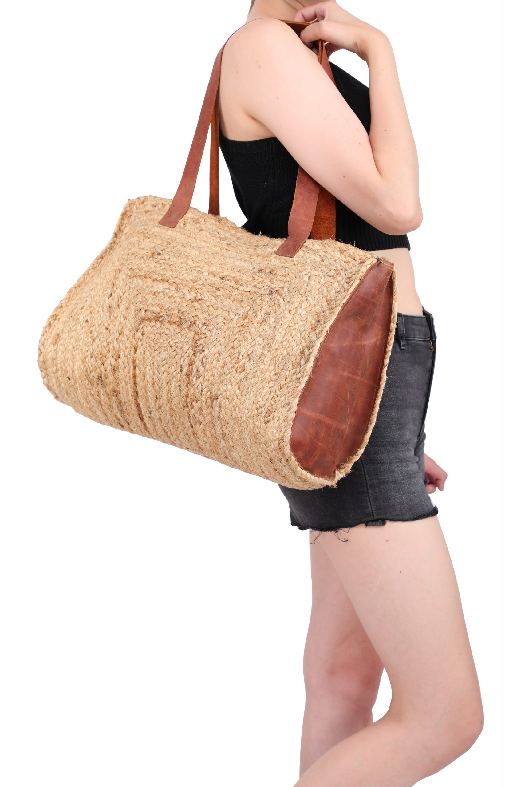 A spacious Carry bag made of handmade cotton carpet with leather handle is excellent to carry while going on a trip.