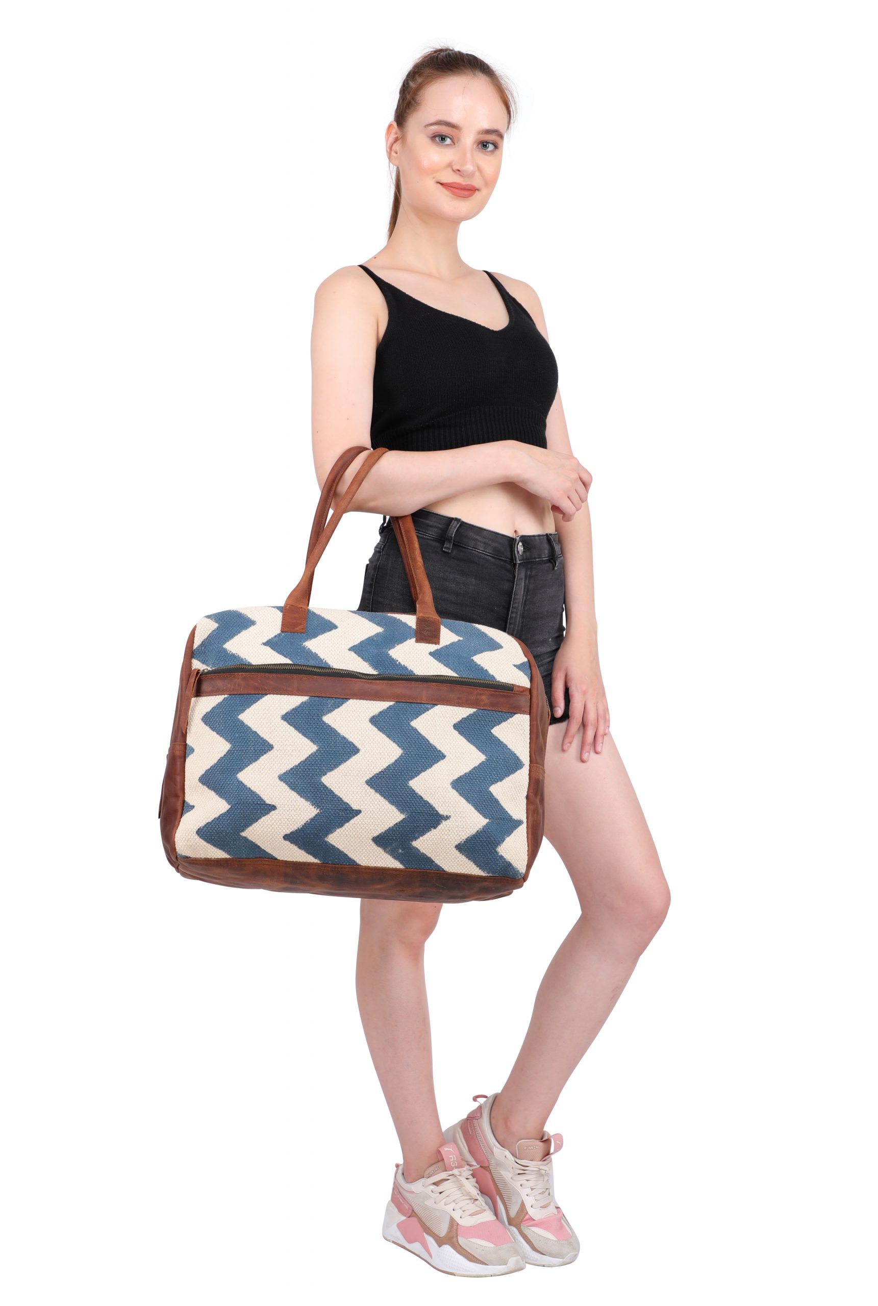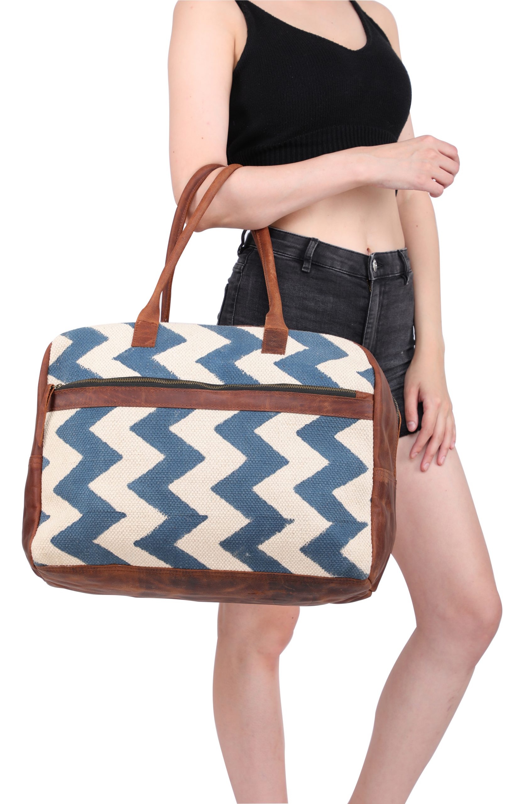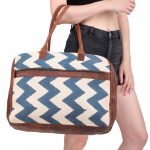A spacious Carry bag made of handmade cotton carpet with leather handle is excellent to carry while going on a trip.