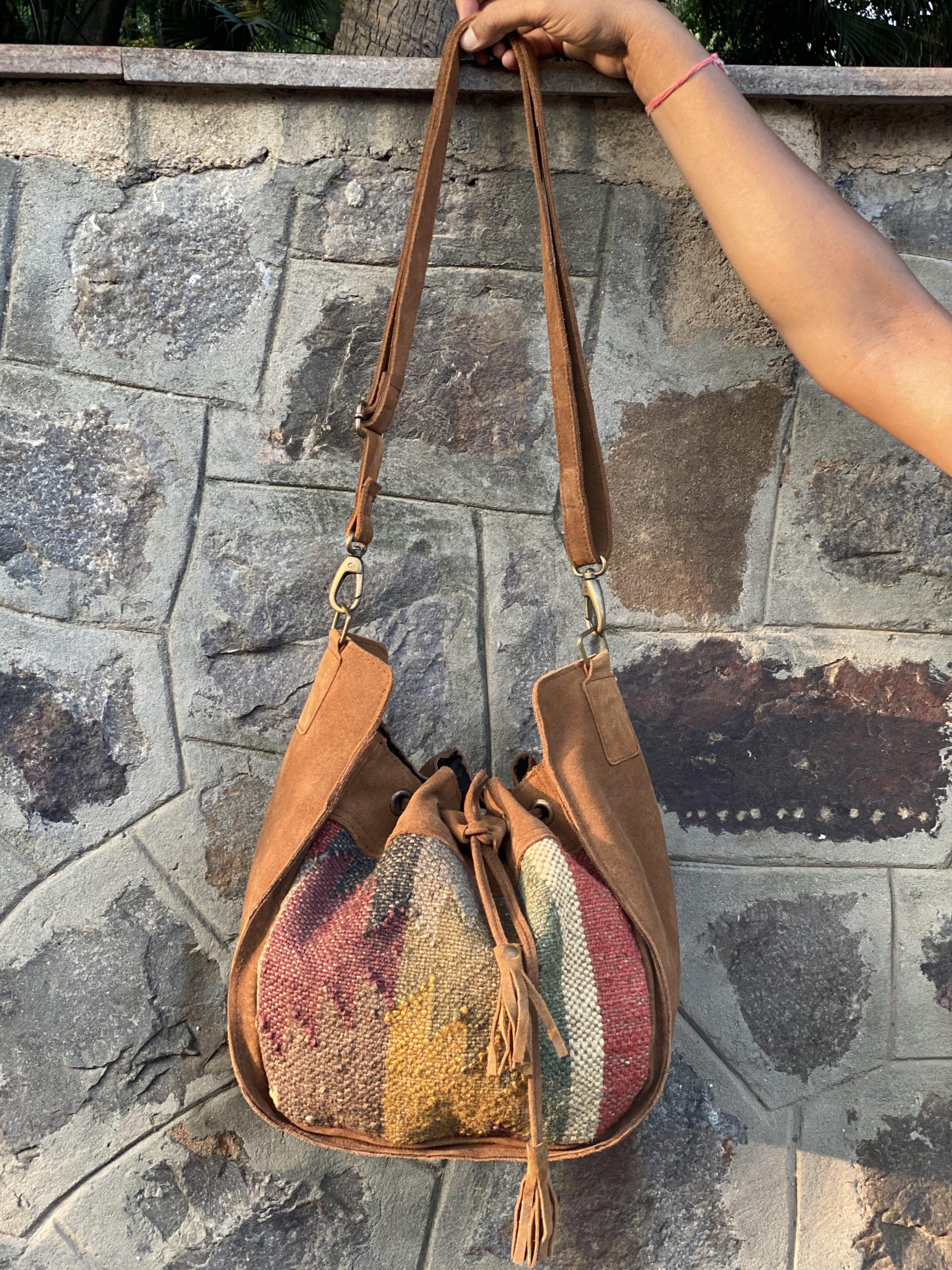 Jute Kilim carpet side bag with leather handle. Spacious, stylish, and perfect for daily use.