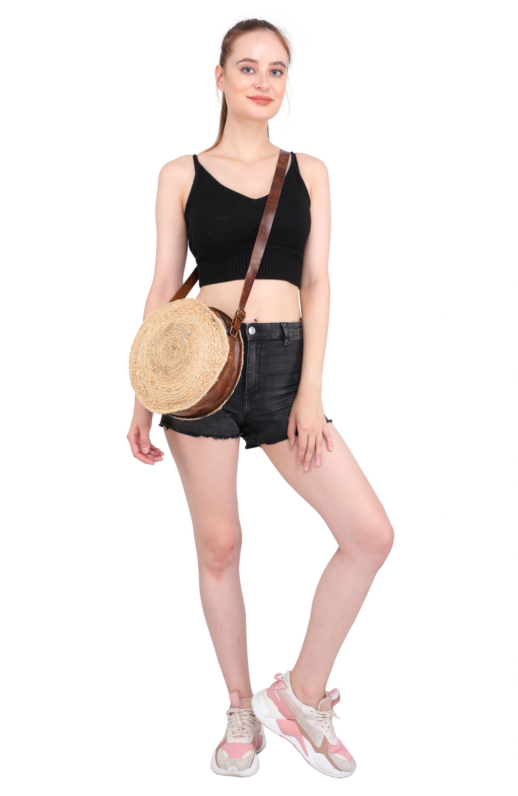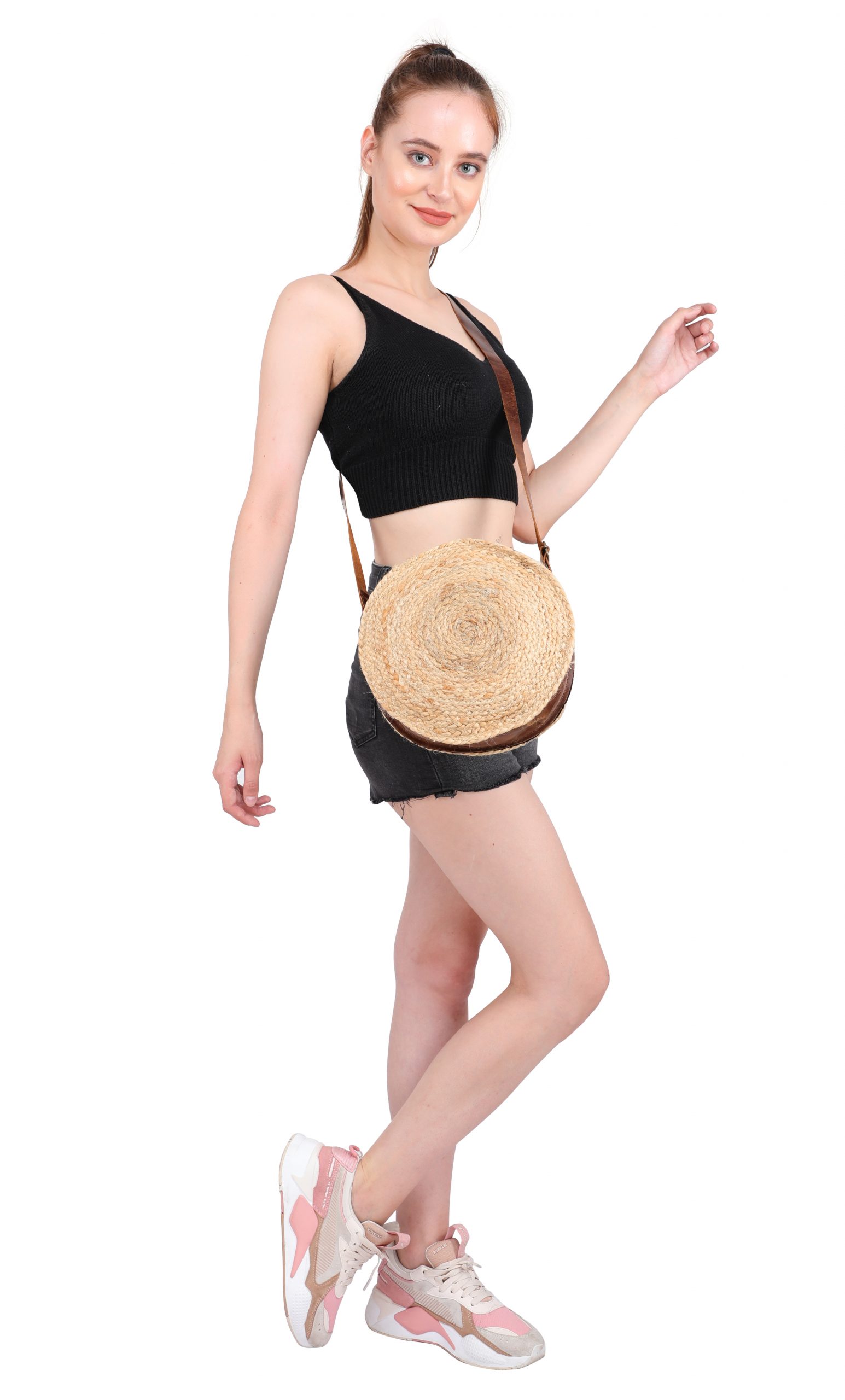 Jute Sling bag with Crunch Leather handle. A perfect sling bag to carry while going out with friends you can also carry it on beaches